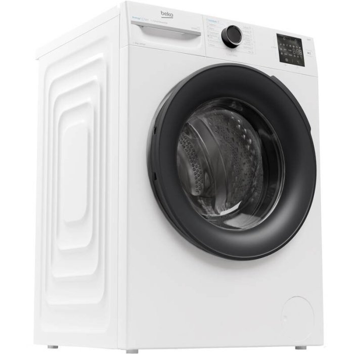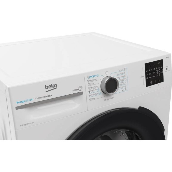 Voľne stojaca práčka Beko s kapacitou 9 kg dosahuje energetickú triedu A a spotrebu 49 kWh na 100 cyklov pri spotrebe vody 49 l na cyklus. Maximálne otáčky odstreďovania 1 400 ot./min a hlučnosť 75 dBA (trieda B) zabezpečujú efektívny výkon. Technológie EnergySpin, SteamCure®, OptiSense® a ProSmart™ invertorový motor optimalizujú spotrebu energie až o 35 % bez kompromisov v kvalite prania.
