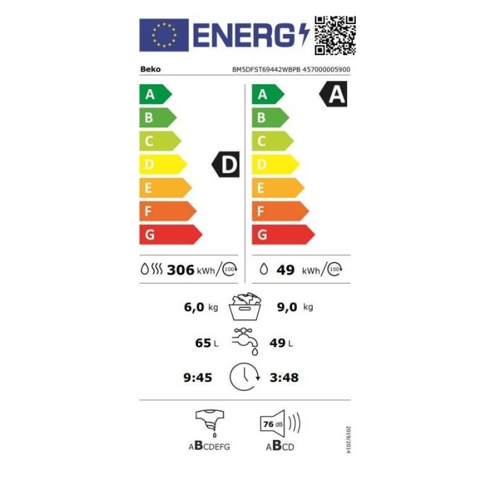 Práčka so sušičkou Beko, kapacita prania/sušenia 9/6 kg, Max. otáčky odstreďovania 1400 ot./min.