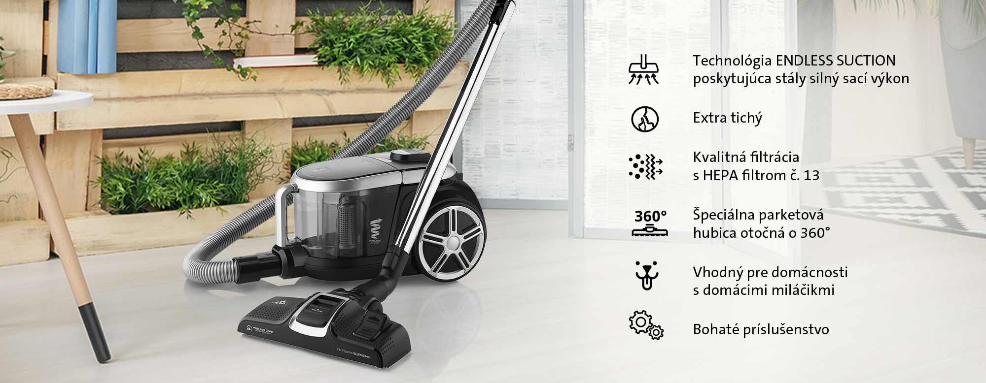 Bezvreckový vysávač s úsporným ECO motorom, elektronickou reguláciou sacieho výkonu, HEPA filtrom a bohatým príslušenstvom