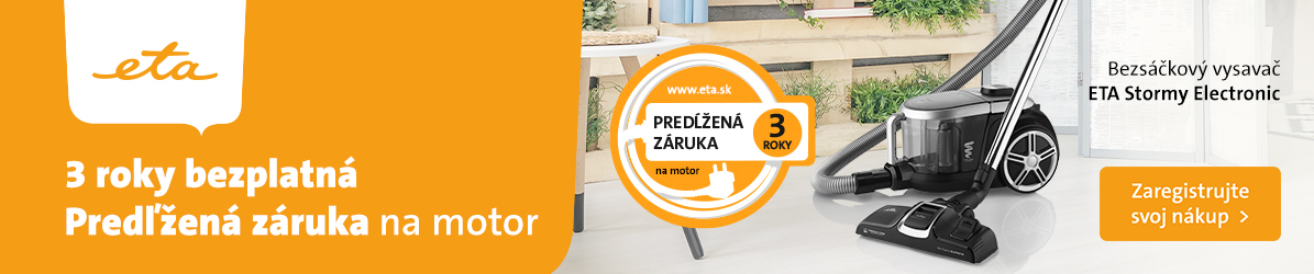 Na bezvreckový vysávač ETA Stormy Electronic značka ETA poskytuje Predĺženú záruku 3 roky na motor. Na získanie záruky sa zadarmo zaregistrujte TU.