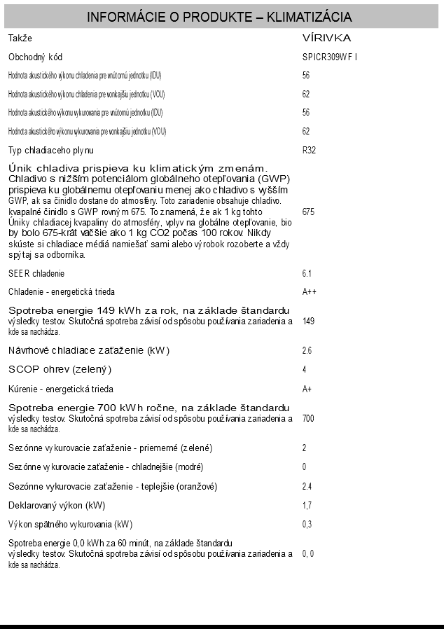 Hladina hluku (vnútorná jednotka) - nízka rýchlosť ventilátora : 29