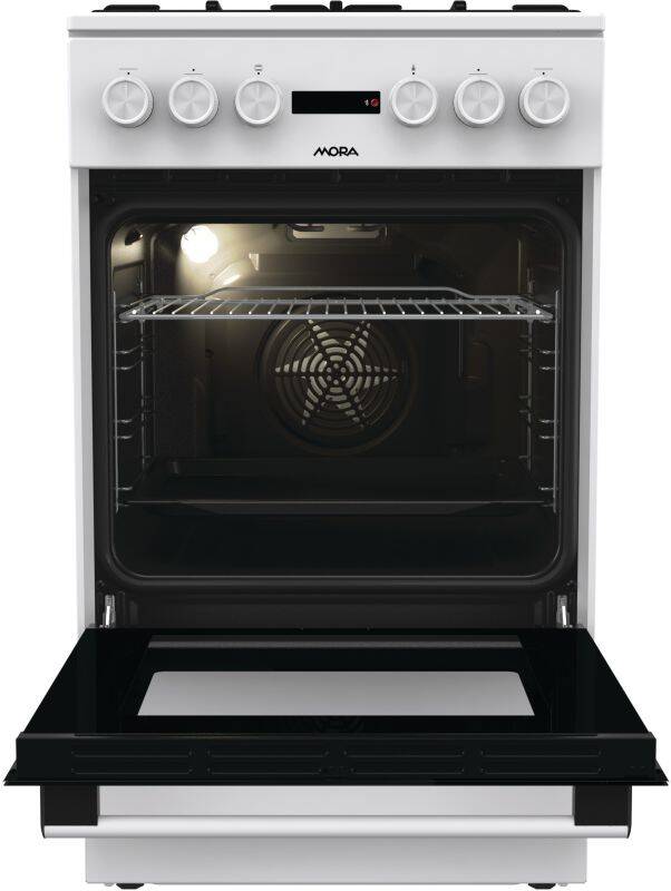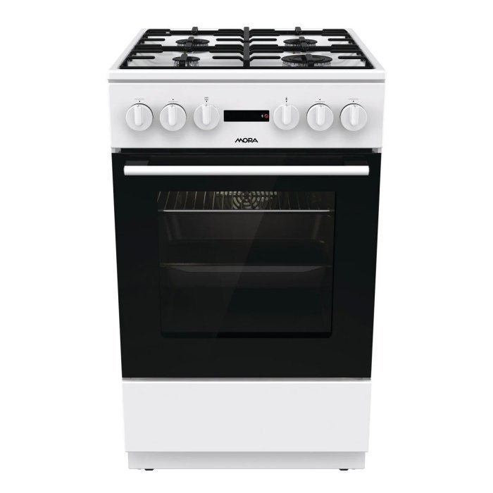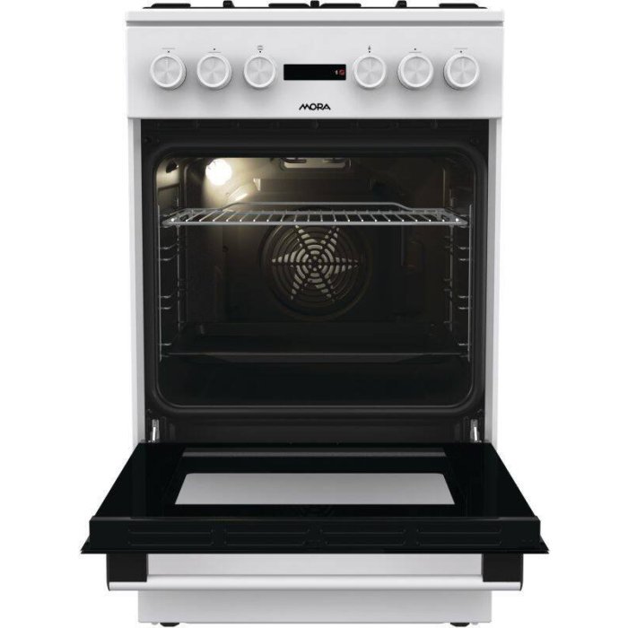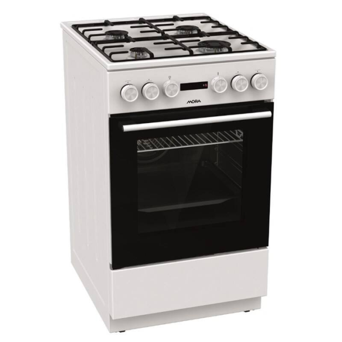 Kombinovaný sporák Mora K 5254 CW je praktický a moderný spotrebič v bielej farbe, vybavený plynovými horákmi a multifunkčnou elektrickou rúrou s objemom 70 l