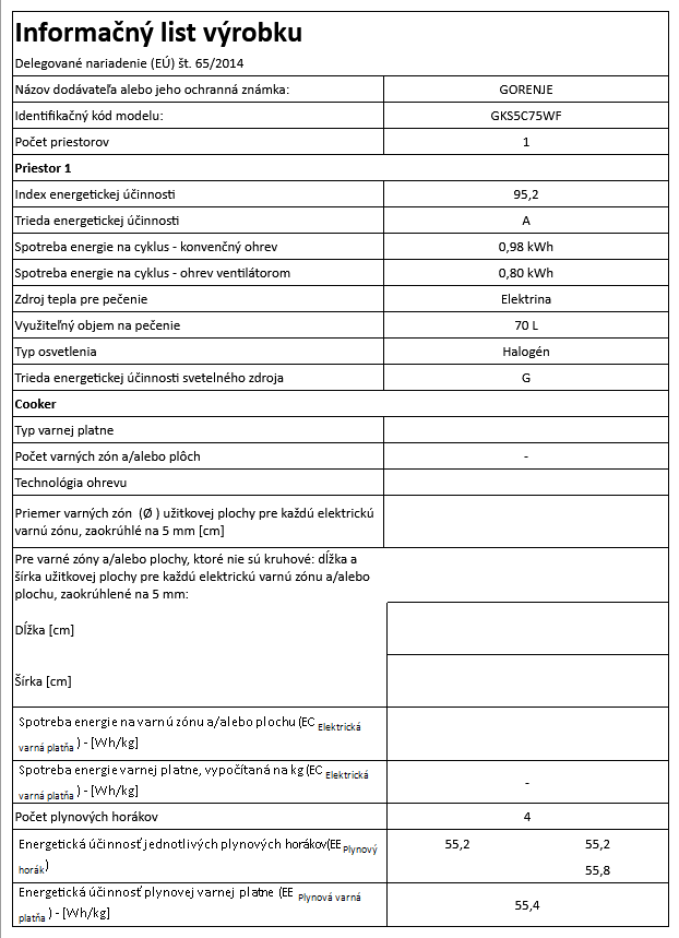 Spotreba energie plynovej rúry na cyklus - konvenčný ohrev (2010/30/ES) 0,0 MJ/cycle