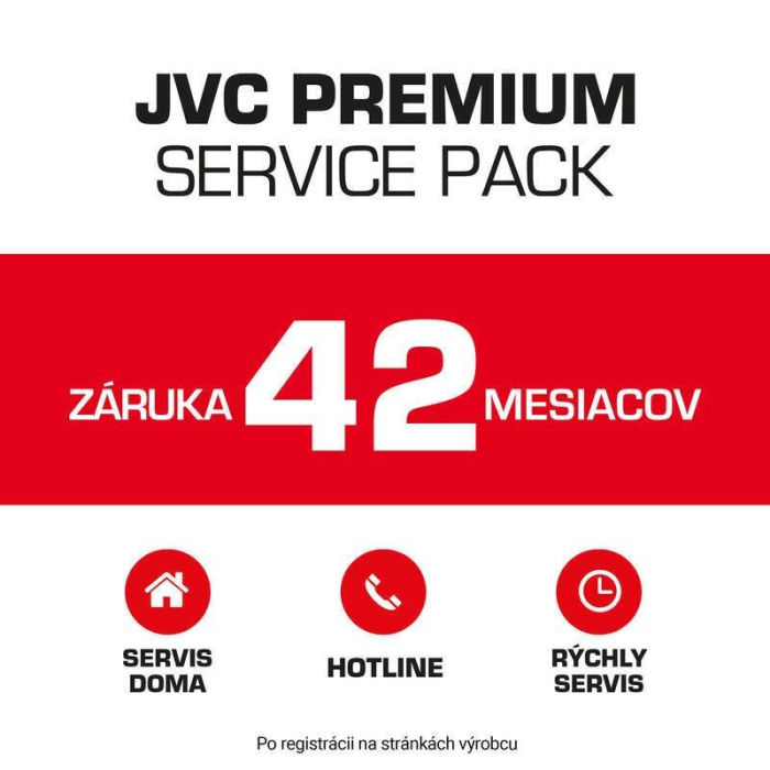 Značka JVC ponúka JVC PREMIUM SERVICE PACK. Na zakúpený televízor získate predĺženú záruku 42 mesiacov a v prípade potreby servisný zásah priamo u vás doma, bez nutnosti prevozu televízora. Stačí sa registrovať do 30 dní od nákupu.