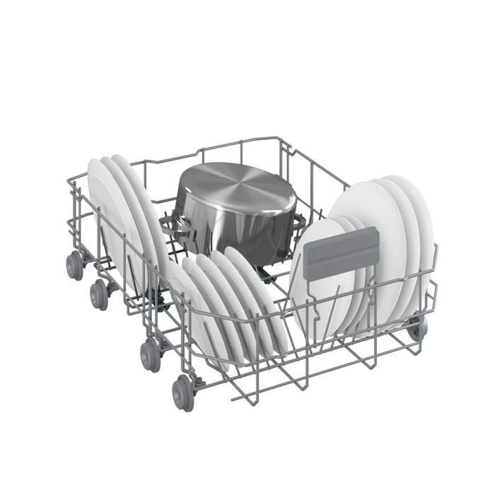 Umývačka ponúka flexibilný vnútorný priestor s nastaviteľným horným košom, ktorý možno jednoducho posunúť do jednej z troch výškových úrovní. K dispozícii sú aj tri sprchovacie úrovne, špeciálne držiaky na nože a posuvný košík na príbory, čo zabezpečuje maximálnu variabilitu pri ukladaní riadu.