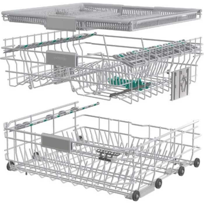 Spodný kôš: Pevná mriežkovaná základňa, Rukoväť, Rukoväť s logom z nehrdzavejúcej ocele, Sklopné/deliteľné zadné držiaky tanierov, Sklopná / deliteľná zadná polica na víno, Vyššia zásuvka s hrubým vodorovným mriežkovaním vpredu hore, 4 sklopné/deliteľné zadné držiaky tanierov