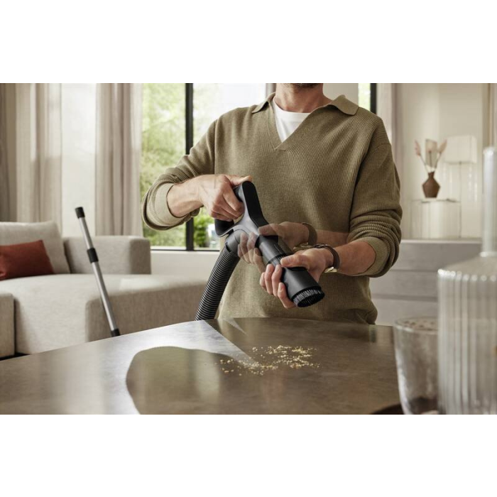 Rukoväť Comfort je navrhnutá pre maximálne pohodlie pri vysávaní. Jej ergonomický tvar znižuje únavu rúk a integrovaný sací štetec umožňuje okamžité použitie na rýchle čistenie prachu z citlivých povrchov.