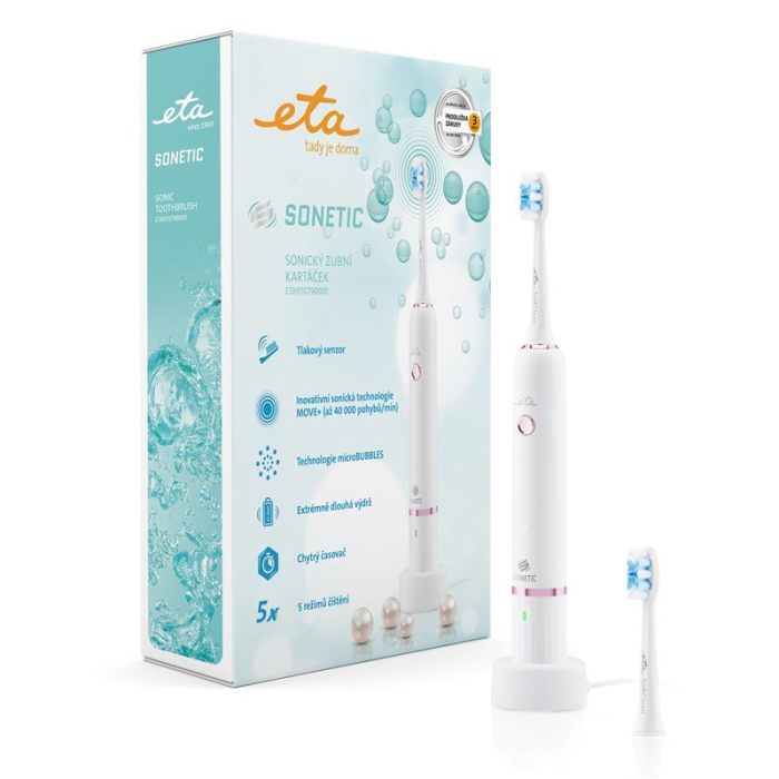 Zdravý chrup je základom každého žiarivého úsmevu. So starostlivosťou o vaše zuby vám radi pomôže naša zubná kefka so sonickou technológiou a až 40 000 pohybmi za minútu. Čistenie je tak vysoko efektívne a rozdiel oproti bežnej zubnej kefke rozhodne spoznáte. Zubná kefka ETA Sonetic je pre vás vhodná aj pokiaľ máte fixné rovnátka, fazety, korunky, zubné implantáty a pod.